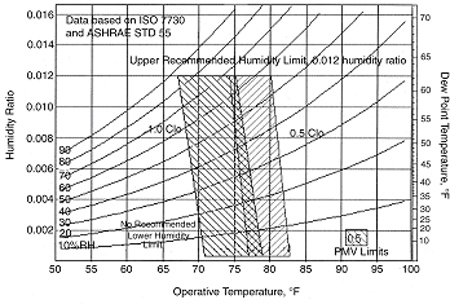 For given values of humidity, air speed, metabolic rate, and clothing insulation, a comfort zone may be determined. The comfort zone is defined in terms of a range of operative temperatures that provides acceptable thermal environmental conditions or in terms of the combinations of air temperature and mean radiant temperature that people find thermally acceptable.