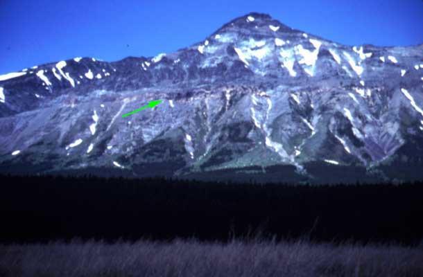 Green arrow points to fault. There, Precambrian rocks of the Belt Supergroup lie directly on top Cretaceous shale and sandstone.